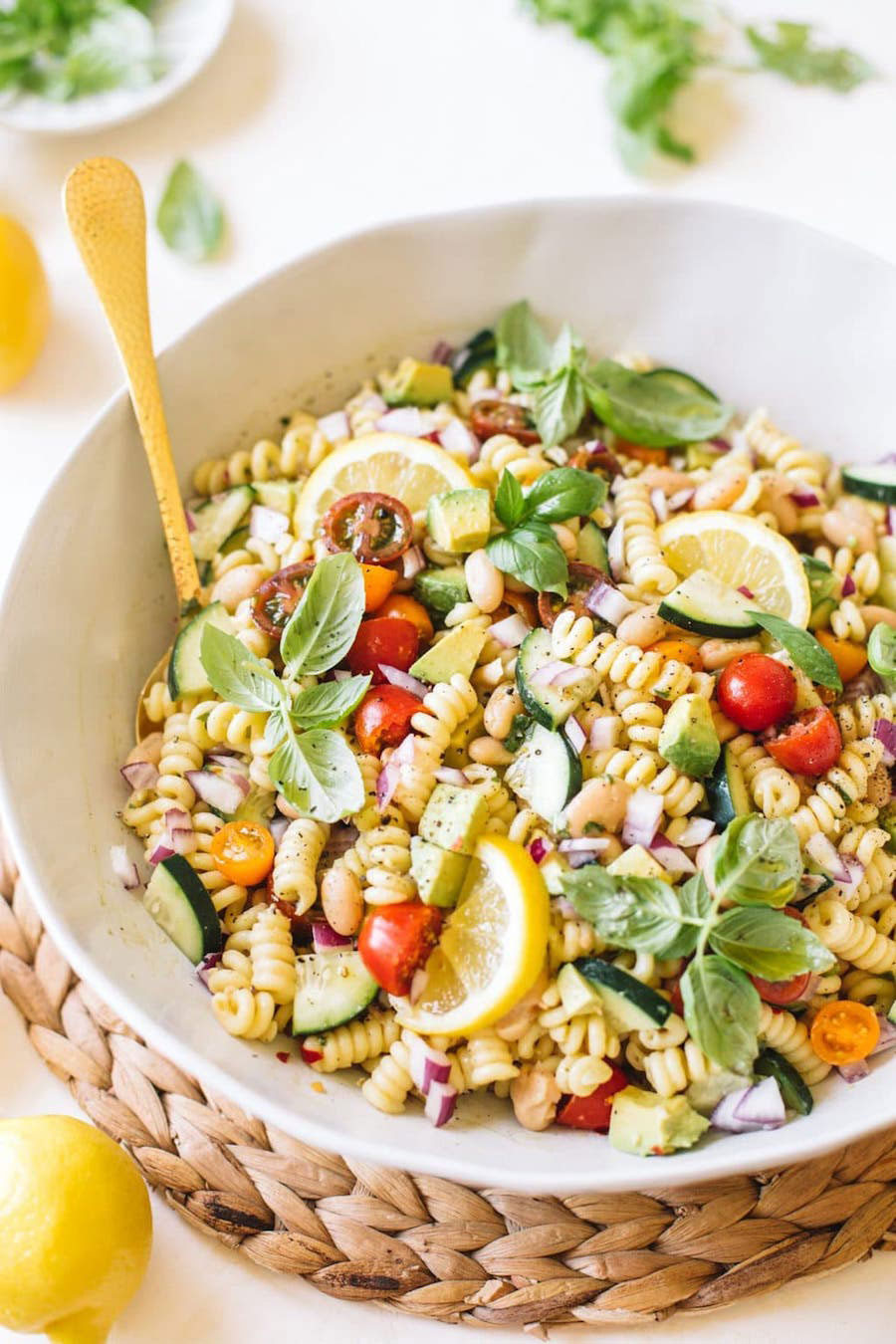 If you love pasta salad but want some extra protein, try this recipe made with avocado and white beans. It’s so versatile and will win you over with its flavorful summer ingredients.