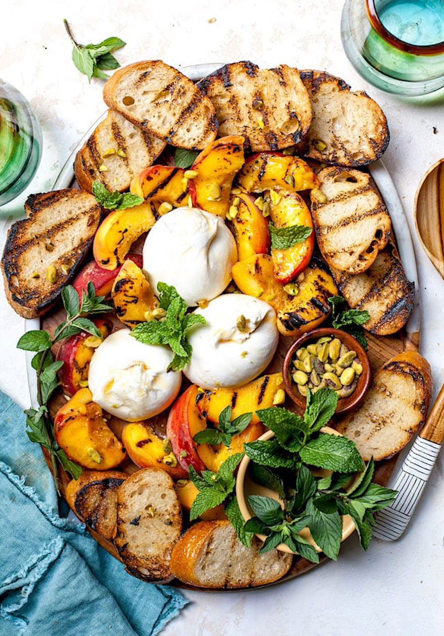 This recipe makes a stunning appetizer in only 20 minutes. Sweet peaches paired with creamy burrata and salty pistachios all heaped on top of crispy, grilled bread—it’s a taste of summer in one simple dish.